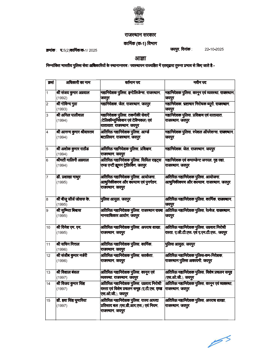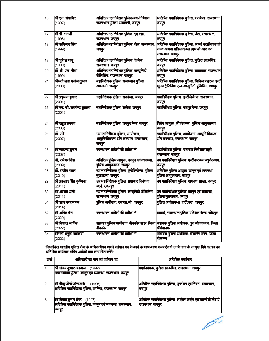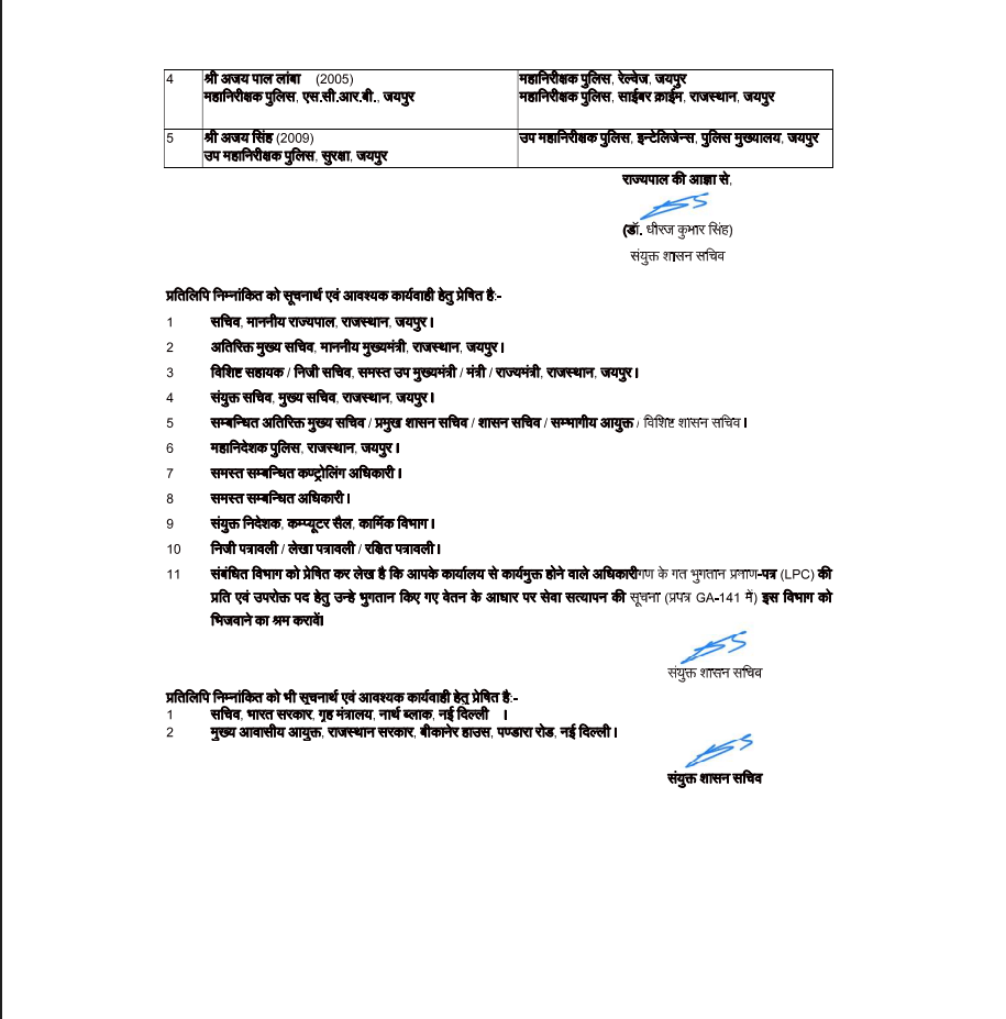 वहीं, दिनेश एम.एन. को एडीजी एंटी टेररिस्ट स्क्वॉड (ATS) और एंटी गैंगस्टर टास्क फोर्स (AGTF) जयपुर का दायित्व सौंपा गया है। उनकी जगह अब वी. के. सिंह को एडीजी लॉ एंड ऑर्डर बनाया गया है।