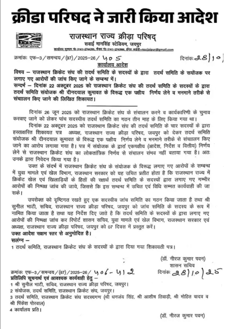 जयपुर। राजस्थान क्रिकेट एसोसिएशन (आरसीए) में आंतरिक विवाद चरम पर पहुंच गया है। खेल परिषद ने आरसीए एडहॉक कमेटी के कन्वीनर दीनदयाल कुमावत के खिलाफ जांच के आदेश जारी किए हैं। जांच का जिम्मा राजस्थान खेल परिषद के सचिव सुनील भाटी को सौंपा गया है, जो 7 दिन में रिपोर्ट खेल मंत्री राज्यवर्धन सिंह राठौड़ को सौंपेंगे।