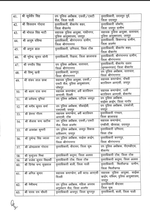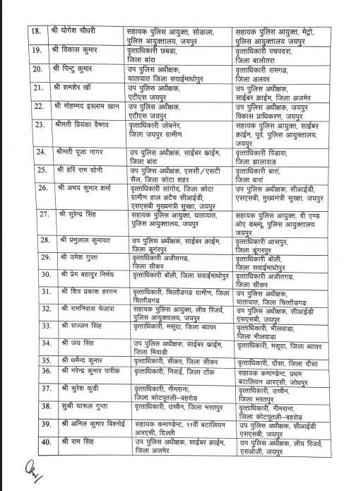 तबादला सूची के अनुसार जयपुर, जोधपुर, बीकानेर, करौली, अलवर, अजमेर, झालावाड़, डूंगरपुर सहित कई जिलों में महत्वपूर्ण स्तर पर बदलाव किए गए हैं। कई अधिकारियों को महिला अपराध अनुसंधान सैल, लीव रिजर्व, अपराध एवं सतर्कता, डिस्कॉम सुरक्षा, प्रोटोकॉल शाखा और विशेष जांच इकाइयों में तैनात किया गया है।