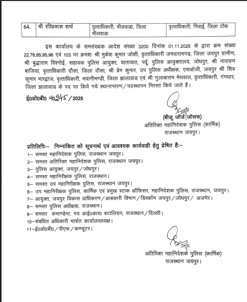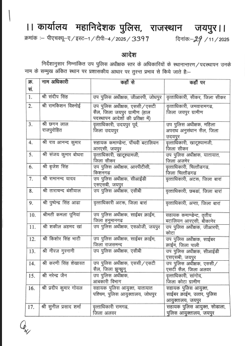 जयपुर। राजस्थान में प्रशासनिक फेरबदल का दौर जारी है। मुख्यमंत्री भजनलाल शर्मा के निर्देश पर गृह (ग्रुप-1) विभाग ने शनिवार, 29 नवंबर को राजस्थान पुलिस सेवा (RPS) के 64 अधिकारियों के व्यापक पैमाने पर तबादले कर दिए। आदेश देर शाम जारी किए गए, जिनमें राज्यभर के विविध जिलों, रेंजों और विशेष इकाइयों में अधिकारियों को नई जिम्मेदारियां सौंपी गई हैं।