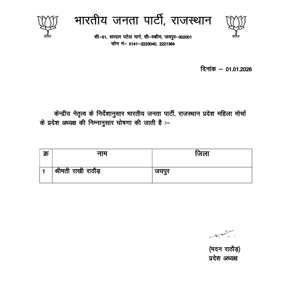 भाजपा प्रदेशाध्यक्ष मदन राठौड़ द्वारा यह नियुक्ति की है। महिला मोर्चा का यह पद निवर्तमान प्रदेश अध्यक्ष रक्षा भंडारी के सिरोही जिला अध्यक्ष बनने के बाद से रिक्त चल रहा था। तीन दिन पहले पार्टी ने छह मोर्चों के प्रदेश अध्यक्षों की घोषणा की थी, लेकिन उस समय महिला मोर्चा को लेकर फैसला लंबित रखा गया था। अब राखी राठौड़ को यह जिम्मेदारी सौंपकर पार्टी ने महिला नेतृत्व को आगे बढ़ाने का स्पष्ट संकेत दिया है।