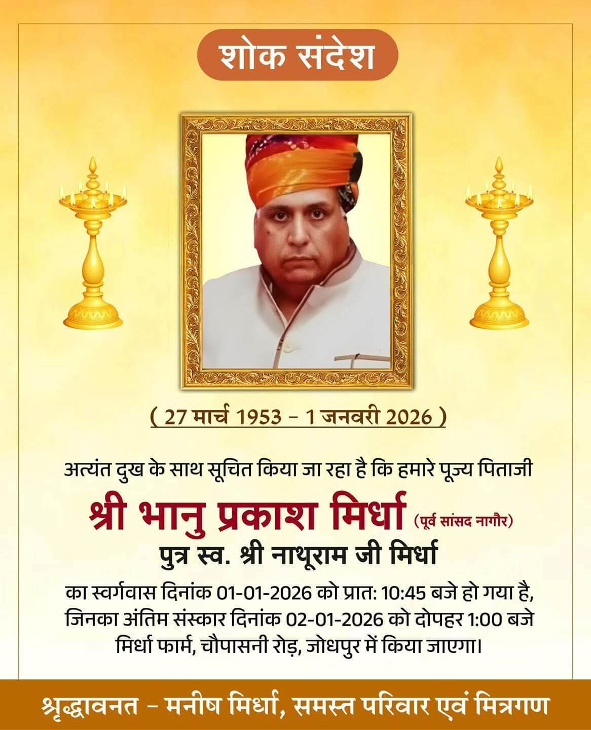 जोधपुर। नागौर से पूर्व सांसद भानुप्रकाश मिर्धा का गुरुवार को जोधपुर स्थित उनके आवास पर निधन हो गया। वे पिछले कुछ समय से अस्वस्थ चल रहे थे। उनके निधन की खबर से राजनीतिक, सामाजिक और मिर्धा परिवार से जुड़े समर्थकों में शोक की लहर फैल गई। भानुप्रकाश मिर्धा ने 11वीं लोकसभा में नागौर लोकसभा क्षेत्र का प्रतिनिधित्व किया था और अल्प कार्यकाल के बावजूद क्षेत्रीय राजनीति में अपनी अलग पहचान बनाई।