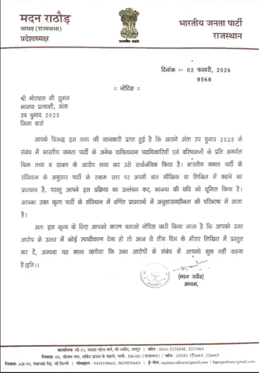 अंता विधानसभा उपचुनाव को लेकर उठे विवाद के बीच भारतीय जनता पार्टी ने अपने ही प्रत्याशी रहे मोरपाल सुमन के खिलाफ सख्त रुख अपनाया है। भाजपा प्रदेशाध्यक्ष मदन राठौड़ ने मोरपाल सुमन को कारण बताओ नोटिस जारी करते हुए तीन दिन के भीतर लिखित स्पष्टीकरण मांगा है। नोटिस में कहा गया है कि सुमन का कृत्य पार्टी अनुशासनहीनता की श्रेणी में आता है और इस पर पार्टी जवाब चाहती है।