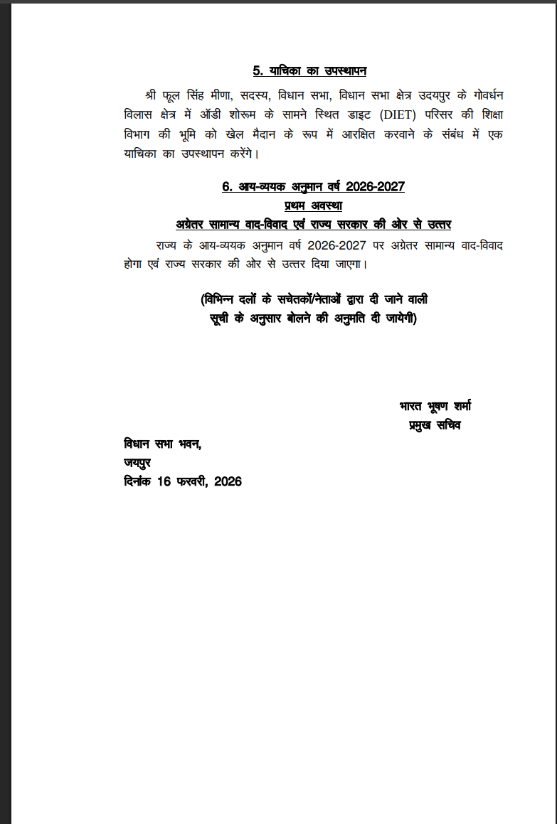 भोजनावकाश के पश्चात बजट पर चर्चा जारी रहेगी। नेता प्रतिपक्ष टीकाराम जूली बजट पर अपना वक्तव्य देंगे। इसके उपरांत उपमुख्यमंत्री दिया कुमारी सदन में उठाए गए प्रश्नों और सुझावों का विस्तृत उत्तर देंगी।