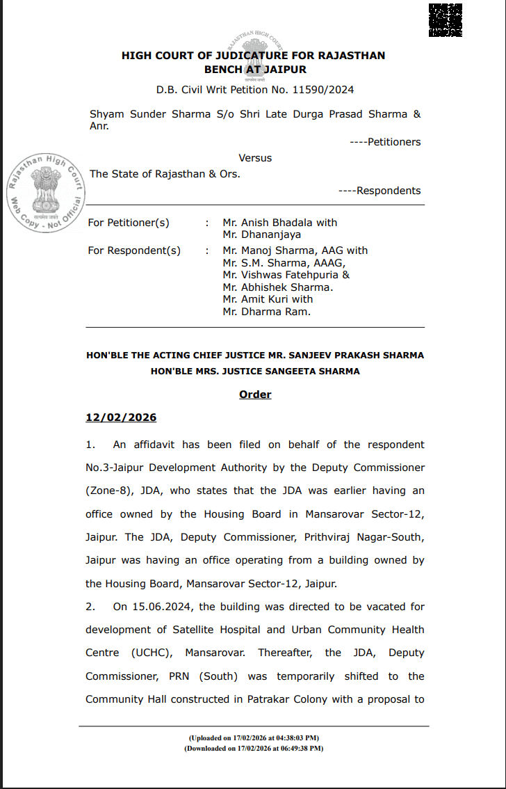 राजस्थान हाईकोर्ट की जयपुर बेंच में वरिष्ठ पत्रकार श्याम सुंदर शर्मा की डी.बी. सिविल रिट पिटिशन संख्या 11590/2024 में सुनवाई करते हुए कार्यवाहक मुख्य न्यायाधीश संजीव प्रकाश शर्मा और न्यायमूर्ति संगीता शर्मा की खंडपीठ ने 12 फरवरी को यह आदेश पारित किया।