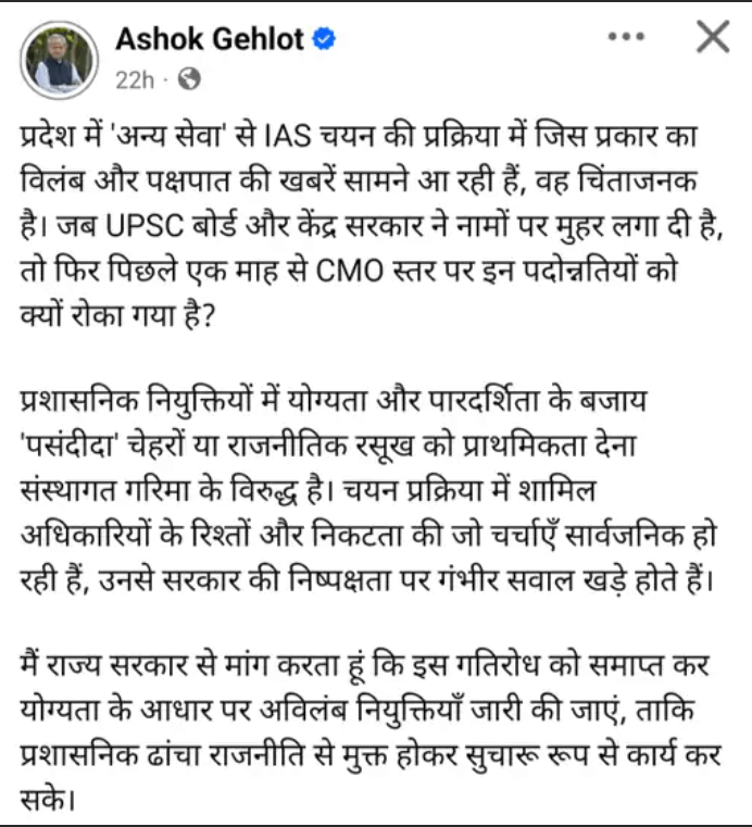 पूर्व मुख्यमंत्री अशोक गहलोत ने सोशल मीडिया प्लेटफॉर्म X पर पोस्ट करते हुए कहा कि जब UPSC और केंद्र सरकार नामों को स्वीकृति दे चुकी है, तो राज्य स्तर पर प्रमोशन रोकने का कारण स्पष्ट किया जाना चाहिए।