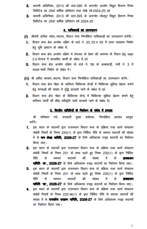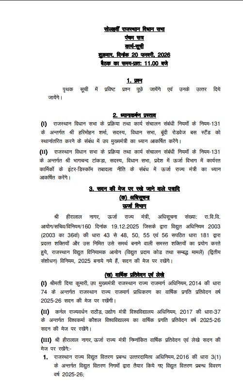 जयपुर। राजस्थान विधानसभा में शुक्रवार, 20 फरवरी को प्रातः प्रश्नकाल के साथ सदन की कार्यवाही शुरू हुई। प्रश्नकाल के दौरान विधायकों ने विभिन्न विभागों से जुड़े मुद्दों पर सरकार से जवाब और स्पष्टीकरण मांगा। सदन में दिनभर महत्वपूर्ण विधायी कार्यवाही होने की संभावना है, जिसमें जनहित से जुड़े विषयों पर चर्चा प्रमुख रहेगी।