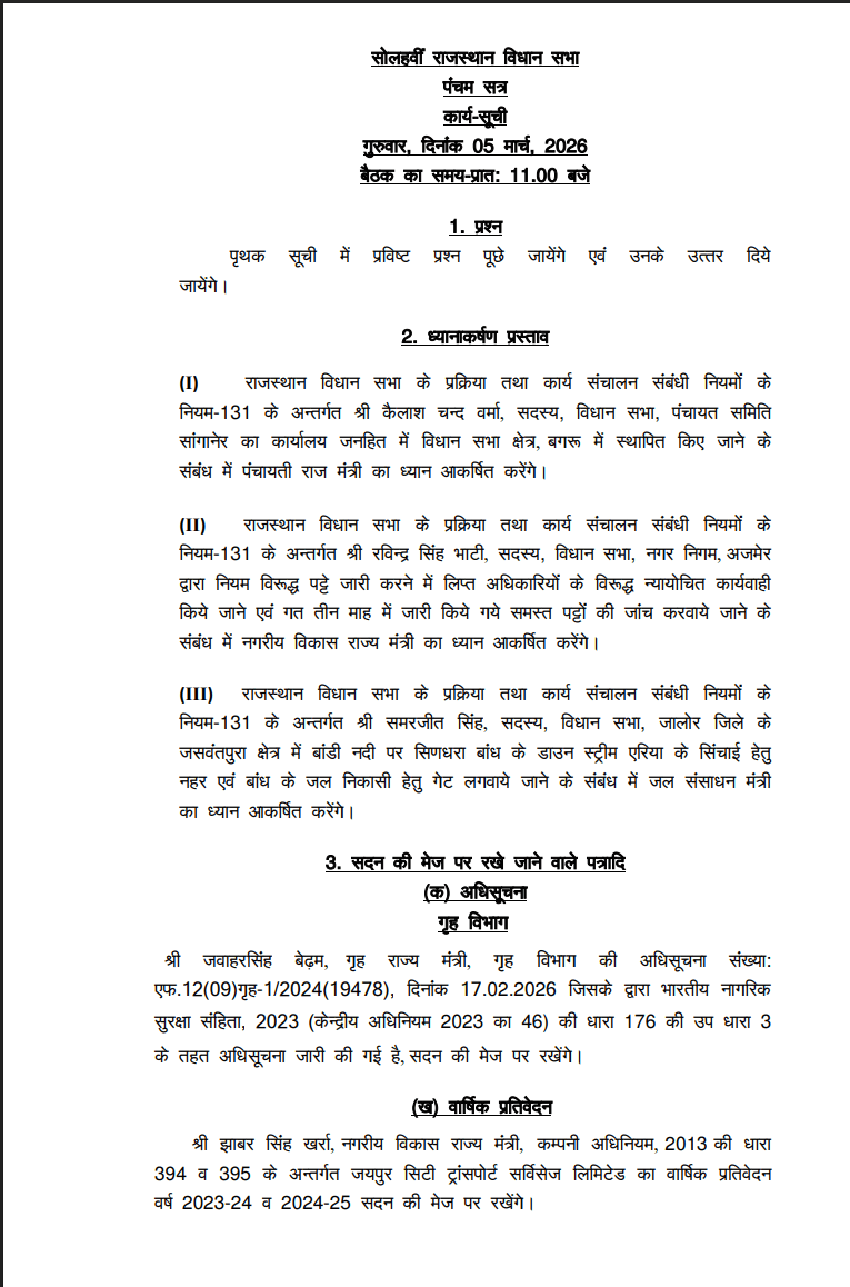 जयपुर। राजस्थान विधानसभा के पंचम सत्र के तहत गुरुवार 5 मार्च 2026 को सुबह 11 बजे सदन की कार्यवाही शुरू हो गई, जिसमें कई महत्वपूर्ण विधायी और प्रशासनिक विषयों पर चर्चा होने की संभावना है। कार्यसूची के अनुसार सबसे पहले प्रश्नकाल होगा, जिसमें सदस्यों द्वारा पूछे गए प्रश्नों के उत्तर दिए जाएंगे। इसके बाद ध्यानाकर्षण प्रस्ताव के तहत विभिन्न मुद्दों पर मंत्रियों का ध्यान आकर्षित किया जाएगा।