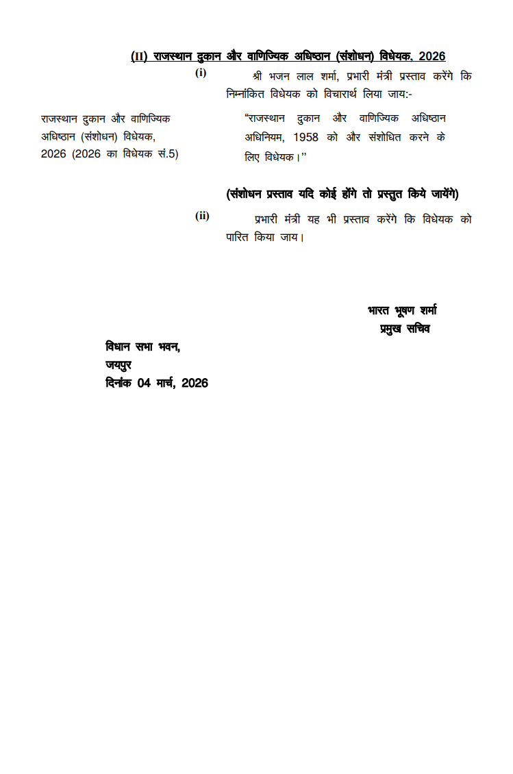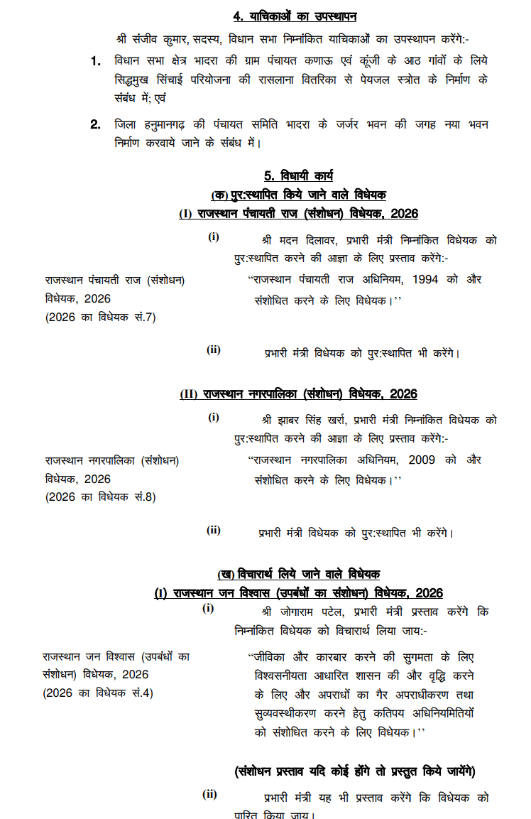 विधानसभा की कार्यवाही के दौरान कई महत्वपूर्ण विधेयक भी पेश किए जाएंगे। इनमें राजस्थान पंचायती राज (संशोधन) विधेयक 2026 और राजस्थान नगरपालिका (संशोधन) विधेयक 2026 प्रमुख हैं। इसके अलावा राजस्थान जन विश्वास (उपबंधों का संशोधन) विधेयक 2026 तथा राजस्थान दुकान और वाणिज्यिक अधिष्ठान (संशोधन) विधेयक 2026 पर भी विचार किया जाएगा। इन विधेयकों के माध्यम से विभिन्न प्रशासनिक और कानूनी प्रावधानों में संशोधन प्रस्तावित हैं, जिन पर सदन में चर्चा के बाद निर्णय लिया जाएगा।