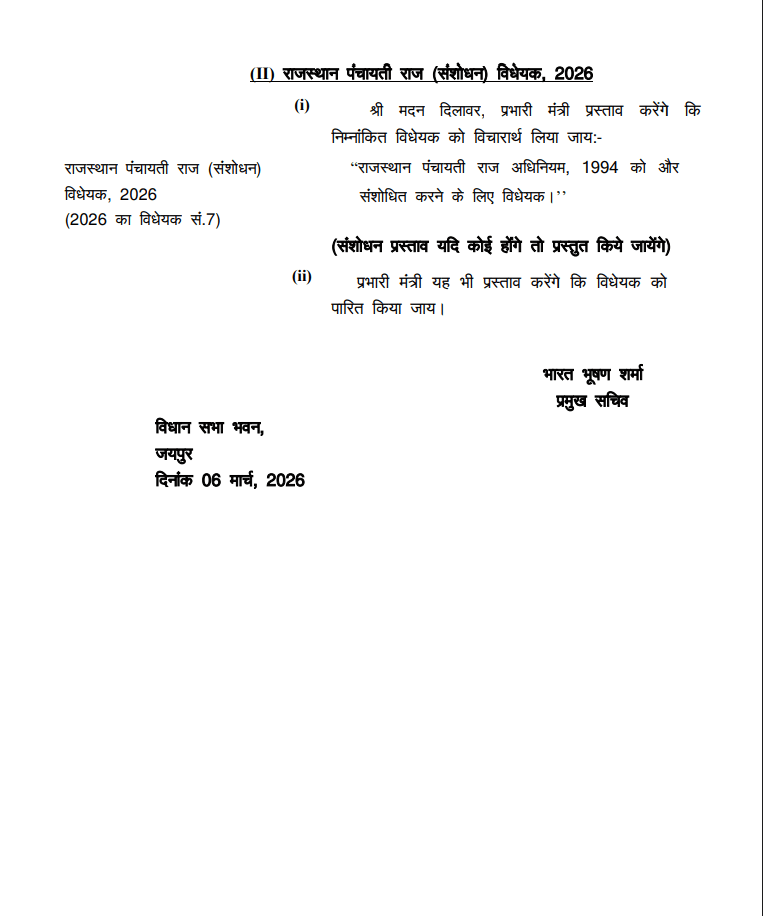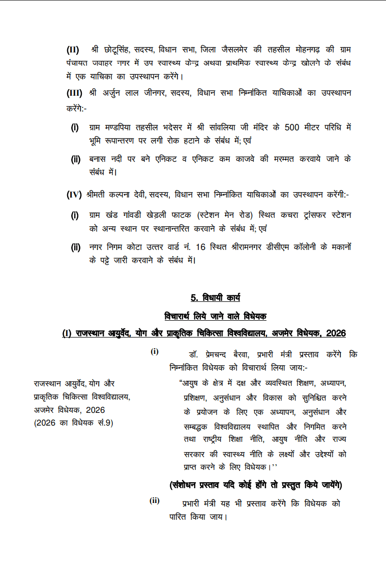 विधायी कार्य के अंतर्गत सदन में दो महत्वपूर्ण विधेयकों पर विचार किया जाएगा। पहला राजस्थान आयुर्वेद, योग और प्राकृतिक चिकित्सा विश्वविद्यालय, अजमेर विधेयक 2026, जिसके माध्यम से आयुष क्षेत्र में शिक्षा, अनुसंधान और प्रशिक्षण को बढ़ावा देने के उद्देश्य से विश्वविद्यालय की स्थापना का प्रस्ताव है। दूसरा राजस्थान पंचायती राज (संशोधन) विधेयक 2026, जिसके जरिए राजस्थान पंचायती राज अधिनियम 1994 में संशोधन प्रस्तावित है।
