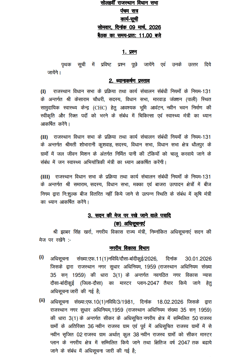 प्रश्नकाल के दौरान अलग से जारी सूची में दर्ज प्रश्न पूछे जाएंगे और मंत्रियों द्वारा उनके उत्तर दिए जाएंगे। इसके बाद नियम 131 के तहत कई महत्वपूर्ण ध्यानाकर्षण प्रस्ताव प्रस्तुत किए जाएंगे। इनमें पाली के मारवाड़ जंक्शन स्थित सामुदायिक स्वास्थ्य केंद्र के लिए भूमि आवंटन, भवन निर्माण और रिक्त पदों को भरने का मुद्दा, धौलपुर क्षेत्र में जल जीवन मिशन के तहत बनी पानी की टंकियों को चालू कराने का मामला तथा मंडियों और बाजारों में किसानों को निशुल्क बीज वितरण नहीं होने से उत्पन्न स्थिति जैसे विषय शामिल हैं।
