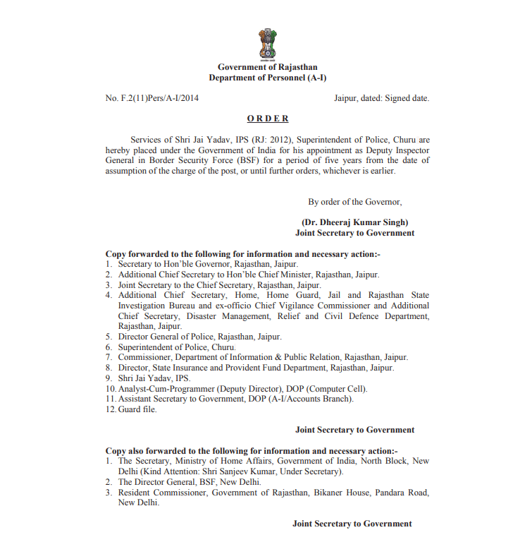 इस आदेश की प्रतिलिपि राज्यपाल सचिवालय, मुख्यमंत्री कार्यालय, मुख्य सचिव, गृह विभाग, पुलिस महानिदेशक सहित विभिन्न विभागों को सूचना एवं आवश्यक कार्रवाई के लिए भेजी गई है। साथ ही केंद्र सरकार के गृह मंत्रालय, BSF मुख्यालय नई दिल्ली और राजस्थान के रेजिडेंट कमिश्नर को भी इसकी जानकारी दी गई है।