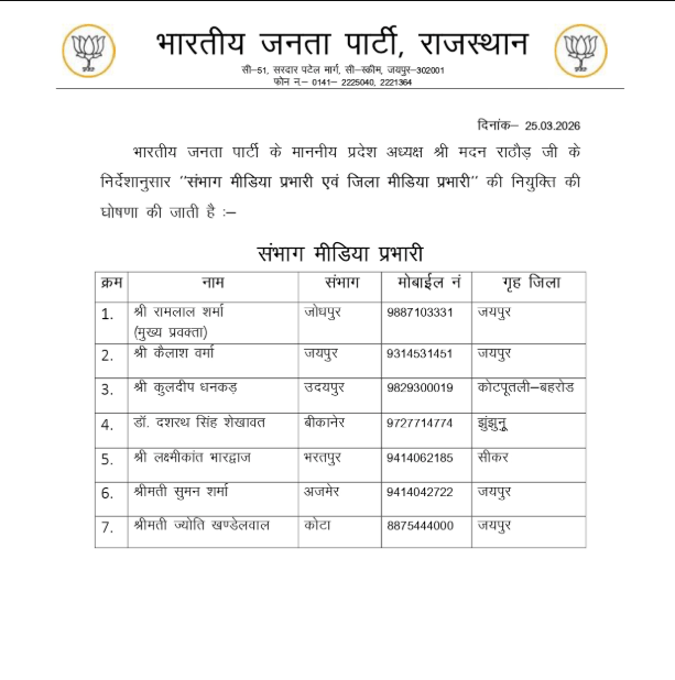 जयपुर। राजस्थान भाजपा में आगामी नगर निकाय और पंचायत चुनावों की तैयारियों के बीच संगठनात्मक बदलाव तेज हो गए हैं। प्रदेश अध्यक्ष मदन राठौड़ ने प्रदेश की मीडिया टीम का विस्तार करते हुए सभी सात संभागों और प्रमुख जिलों के लिए मीडिया प्रभारियों की घोषणा की है।
