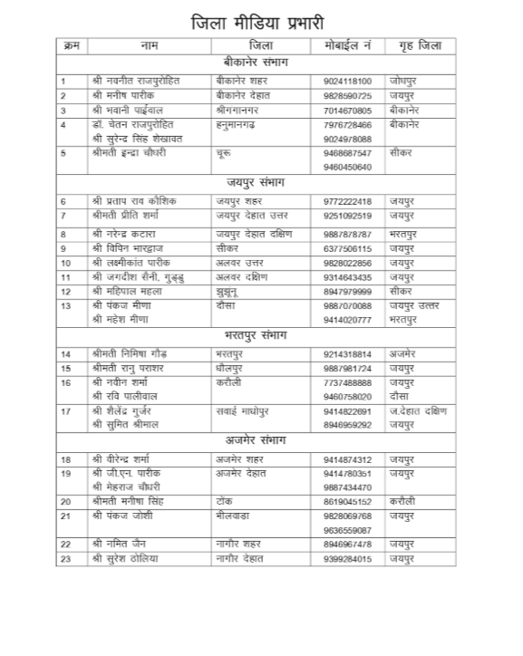 संभागों के अलावा पार्टी ने 44 जिलों में भी मीडिया प्रभारियों की नियुक्ति की है। इन नियुक्तियों में स्थानीय सामाजिक और राजनीतिक समीकरणों को ध्यान में रखा गया है, ताकि चुनावी रणनीति को प्रभावी ढंग से लागू किया जा सके।