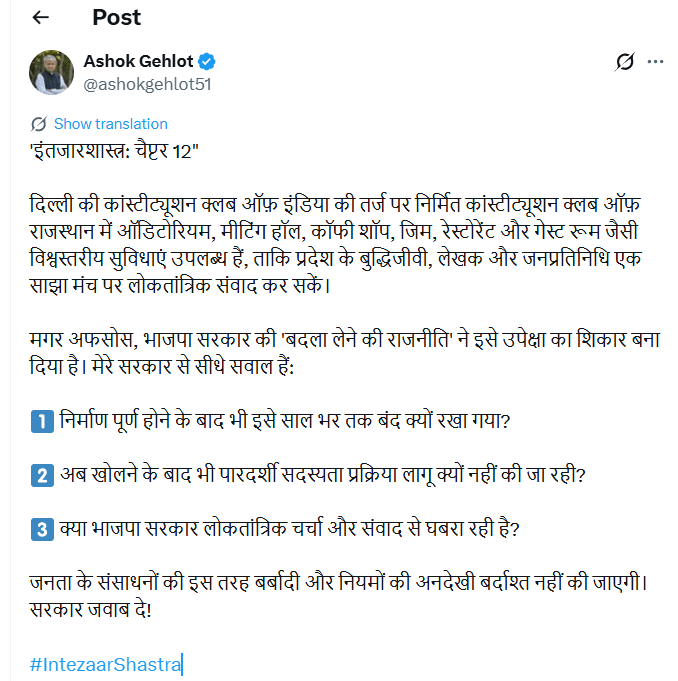 जयपुर। राजस्थान के पूर्व मुख्यमंत्री अशोक गहलोत ने अपनी चर्चित सीरीज ‘इंतज़ारशास्त्र’ के चैप्टर-12 में जयपुर स्थित ड्रीम प्रोजेक्ट ‘कांस्टीट्यूशन क्लब ऑफ राजस्थान’ को लेकर भाजपा सरकार पर तीखा हमला बोला है। गहलोत ने आरोप लगाया कि यह विश्वस्तरीय क्लब, जिसे दिल्ली के कांस्टीट्यूशन क्लब ऑफ इंडिया की तर्ज पर बनाया गया था, आज ‘बदला लेने की राजनीति’ का शिकार हो गया है और अपनी संभावनाओं के बावजूद उपेक्षा झेल रहा है।