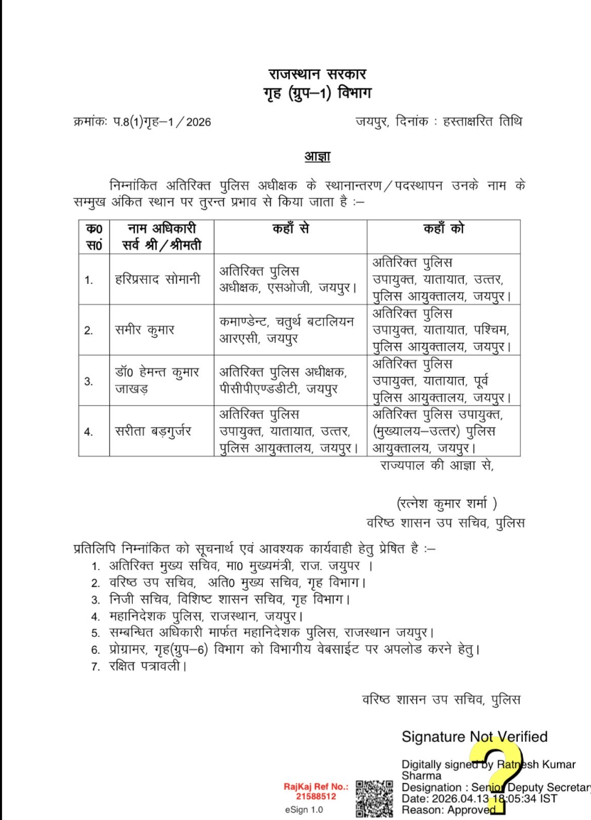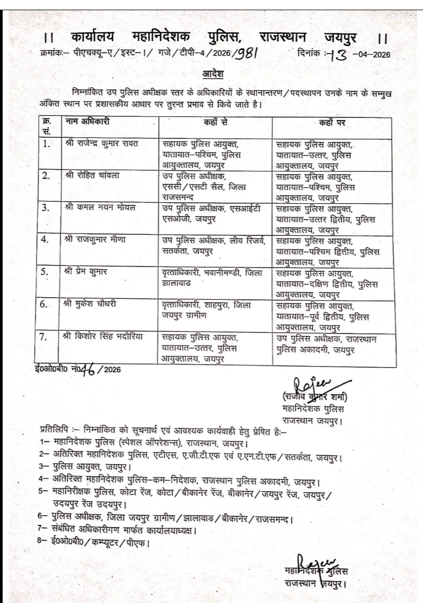 इसके बाद जयपुर ट्रैफिक पुलिस में व्यापक स्तर पर तबादलों का दौर शुरू हुआ है। कई थाना प्रभारियों, ट्रैफिक इंस्पेक्टरों और संबंधित अधिकारियों को इधर-उधर किया गया है। यह कदम ट्रैफिक व्यवस्था को सुधारने और भविष्य में ऐसी घटनाओं की पुनरावृत्ति रोकने के उद्देश्य से उठाया गया बताया जा रहा है।