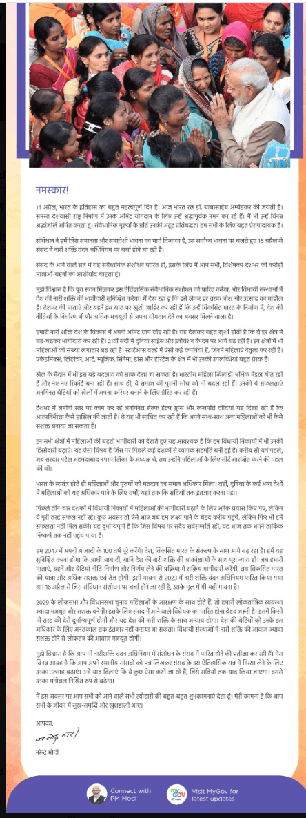 सोशल मीडिया प्लेटफॉर्म X पर साझा किए गए संदेश में प्रधानमंत्री मोदी ने लिखा कि यह पत्र भारत की ‘नारी शक्ति’ को समर्पित है और इसमें उस ऐतिहासिक वादे को पूरा करने की प्रतिबद्धता व्यक्त की गई है, जो दशकों से लंबित रहा है। उन्होंने नागरिकों से अपील की कि वे अपने-अपने सांसदों को पत्र लिखकर इस दिशा में समर्थन व्यक्त करें, ताकि संसद में इस विषय पर सकारात्मक माहौल बन सके।