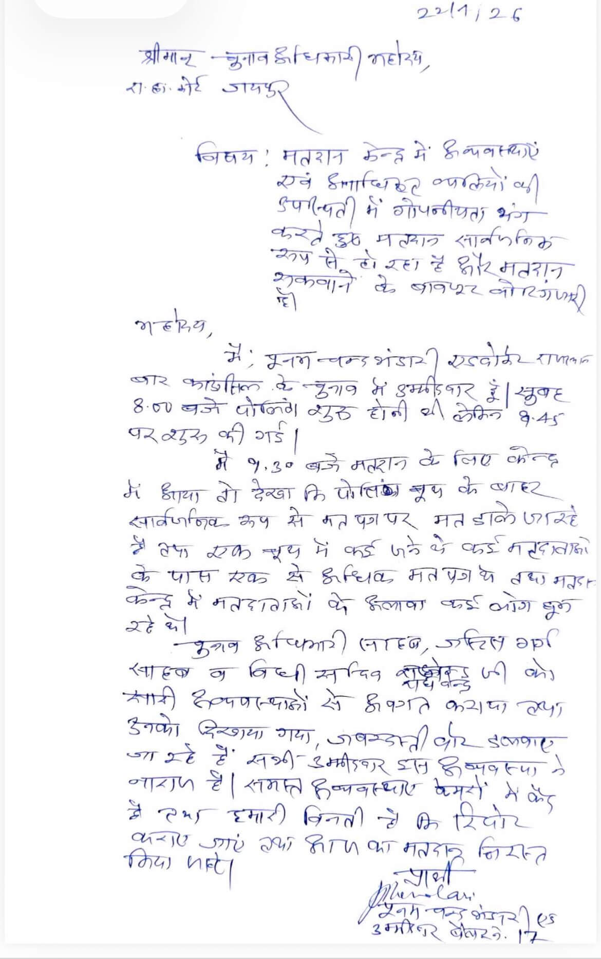 वहीं सांगानेर पोलिंग बूथ पर भी मतदान की गोपनीयता को लेकर विवाद खड़ा हो गया। बीसीआर सदस्य प्रत्याशी अधिवक्ता प्रहलाद शर्मा, हनुमान शर्मा और राम मनोहर शर्मा ने रिटर्निंग अधिकारी से शिकायत कर बताया कि बैलट पेपर पर अंकित क्रमांक के जरिए मतदाता की पहचान संभव है, जिससे वोट की गोपनीयता प्रभावित हो रही है। अधिवक्ताओं ने सांगानेर बूथ का चुनाव भी रद्द करने की मांग की है।
