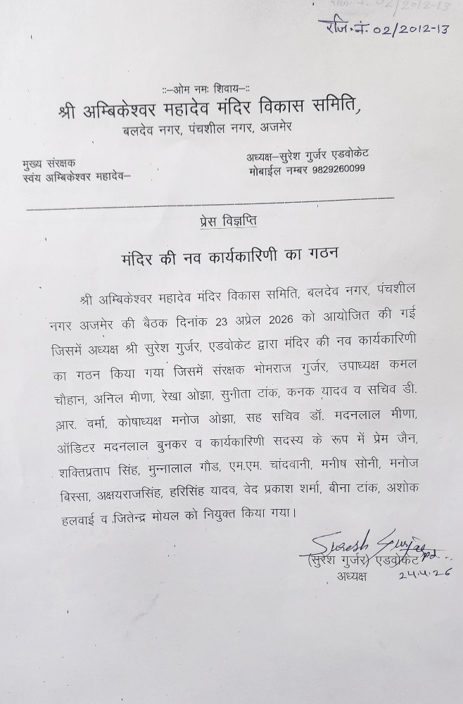 अजमेर। श्री अंबिकेश्वर महादेव मंदिर विकास समिति, बलदेव नगर पंचशील, अजमेर की एक महत्वपूर्ण बैठक 23 अप्रैल 2026 को आयोजित की गई। बैठक में मंदिर समिति के अध्यक्ष सुरेश गुर्जर एडवोकेट की अध्यक्षता में समिति की नई कार्यकारिणी का गठन किया गया। बैठक में मंदिर के विकास, व्यवस्थाओं को मजबूत करने और धार्मिक गतिविधियों के सुचारु संचालन पर भी चर्चा की गई।